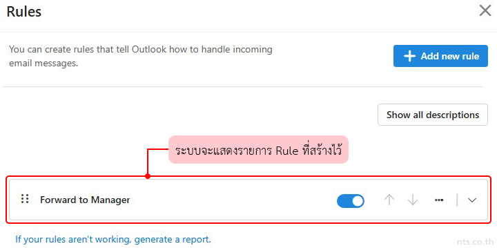 ระบบจะแสดงรายการ Rule ที่สร้างไว้ ซึ่งเงื่อนไขที่สร้างจะแสดงสถานะถูกเปิดใช้งาน (สวิตช์สีฟ้า) เพียงเท่านี้ก็เสร็จสิ้นการตั้งค่า Forward อีเมลอัตโนมัติแล้ว