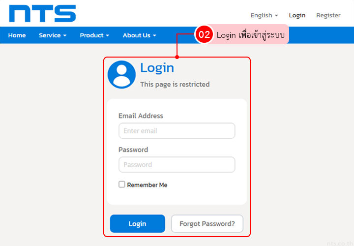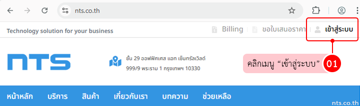 1. แถบด้านบนสุด ในเว็บ nts.co.th คลิก “เข้าสู่ระบบ“
