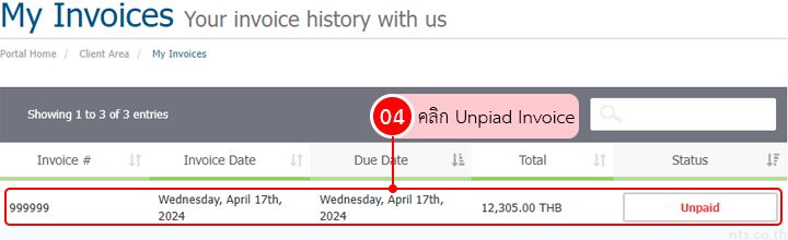 4. ในส่วน My Invoices คลิก ใบแจ้งค่าบริการที่ยังไม่ได้ชำระ