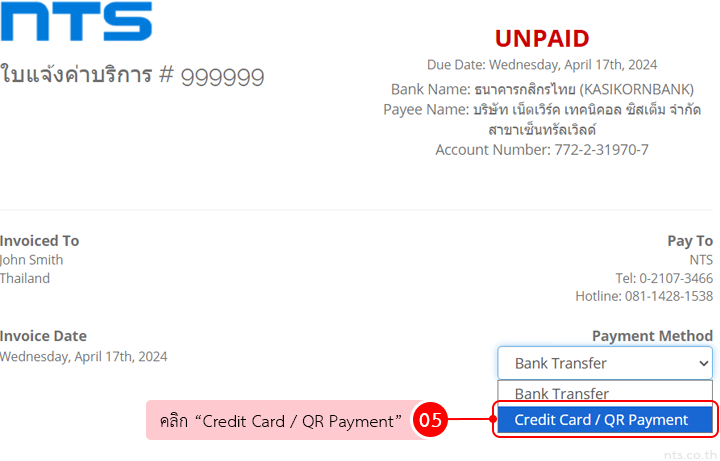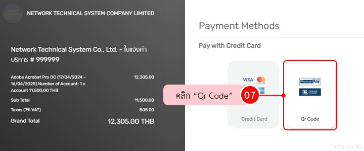 5. เมื่อแสดงใบแจ้งค่าบริการแล้ว ไปที่ Payment Methods และเลือก Credit Card / QR Payment
