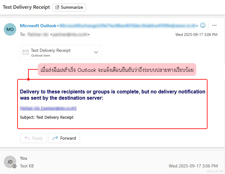 เมื่ออีเมลถูกส่งสำเร็จ Outlook จะส่งแจ้งเตือนกลับมายืนยันว่าอีเมลถูกส่งไปถึงระบบปลายทางเรียบร้อยแล้ว