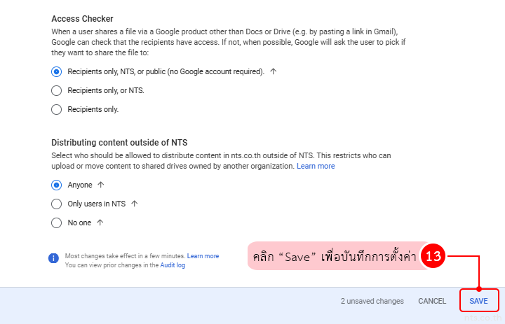 - แนะนำให้เลือก Recipients only, [โดเมนองค์กร], or public (no Google account required)