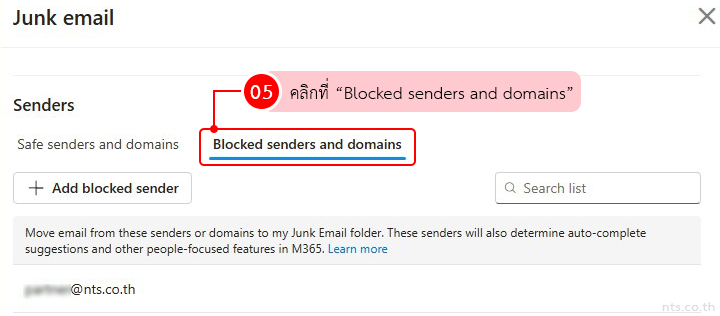 ภายใต้หัวข้อ Senders ให้คลิกที่หัวข้อ “Blocked senders and domains” จะเห็นรายชื่อที่เคยบล็อกไว้ทั้งหมด
